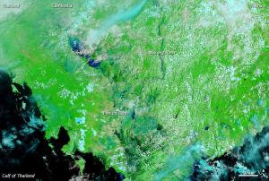 Despite cloud cover, significant changes are apparent along the Mekong River between 2010 and 2011. In 2010, the river is a thin blue line extending southward toward Phnum Penh (Phnom Penh). In 2011, flood water spans kilometers north of the city. Higher water is also apparent…