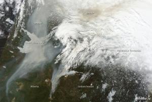 On May 16, 2011, tan and gray smoke spread hundreds of kilometers across Alberta, Saskatchewan, and the Northwest Territories in Canada. At 10:00 a.m., the Alberta government reported 116 fires burning in the province, 34 of them out of control. The following day, the total number of fires had dropped to 100, and the number of uncontrolled fires had dropped to 22. But four new fires had started to burn out of control.
