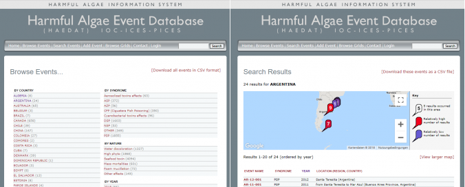 HAEDAT Disclaimer: The HAEDAT database contains information based on yearly national reports by ICES and PICES member states. The available information on individual events varies greatly from event to event or country to country. Monitoring intensity, number of monitoring stations, number of samplings, stations, etc. also varies greatly and therefore there is not a direct proportionality between recorded events and actual occurrences of e.g. toxicity in a given region. Furthermore, areas with numerous recorded occurrences of HAE's, but with an efficient monitoring and management programmes, may have very few problems and a low risk of intoxications, whereas rare HAE's in other areas may cause severe problems and represent significant health risks.
