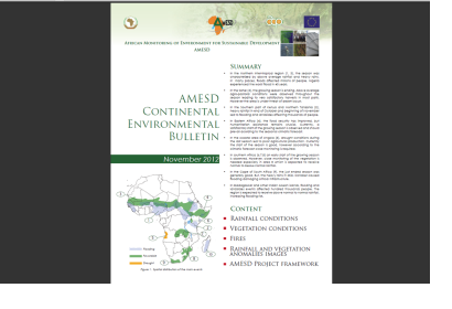 The African Monitoring of Environment for Sustainable Development (AMESD) released a new issue of their Continental Environmental Bulletin for Africa. Based on the analysis of remote sensing imagery and of derived environmental indicators, the publication looks at rainfall conditions, vegetation conditions, fires as well as on rainfall and vegetation anomalies on the African continent. It furthermore addresses the AMESD project framework.