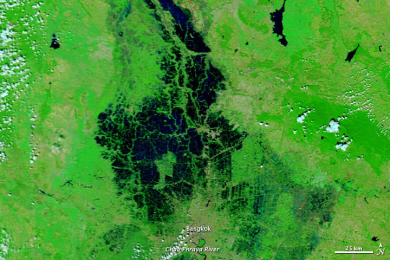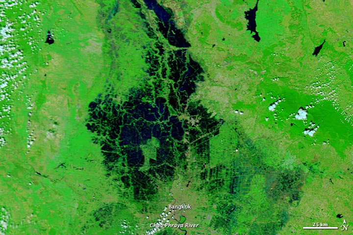 By late November 2011, floods were receding around Thailand’s capital city of Bangkok, but only slowly. These images from the Moderate Resolution Imaging Spectroradiometer (MODIS) on NASA’s Terra satellite compare conditions around the city on November 28, 2011 (top), and November 1, 2011 (bottom).