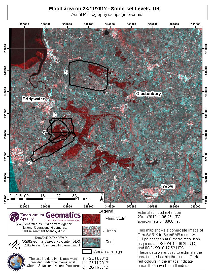 The International Charter "Space and Major Disasters" was activated on 27 November 2012 by the Environment Agency of England and Wales, after widespread floods had hit a number of regions. Among the affected areas are: Somerset levels, Oxford, Tewkesbury, Darlington to York, Nene Washlands, and Nottingham. Approximately 1,800 properties have flooded since last Wednesday, while flood defences have protected more than 54,000 homes. Over 106,000 properties have been sent a flood warning.