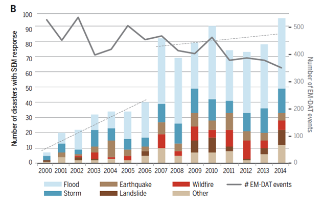 Number of disasters with satellite response. Image: EM-DAT: The Emergency Events Database – Université catholique de Louvain (UCL) – CRED, – www .emdat .be, Brussels, Belgium.