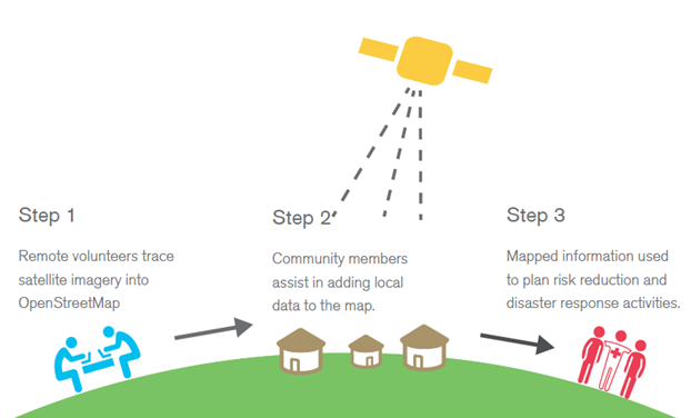 For instance, Missing Maps is a project launched in 2014 and spearheaded by the American Red Cross, the British Red Cross, Médecins Sans Frontières–UK and the Humanitarian OpenStreetMap Team. It uses volunteers to add information to maps in order to better serve those affected by a crisis and get assistance to them more rapidly. In the first stage, volunteers edit satellite imagery to add details.