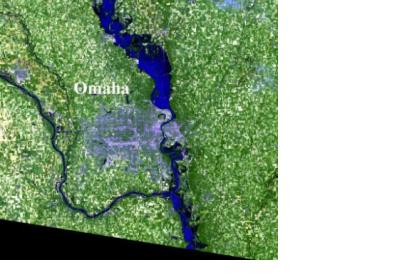 The Landsat 5 image captured was an enlargement of the area just north of Omaha. The flood waters show up as very dark blue and, where the water is shallow, medium blue. In the image, the Interstate is cut off by flood waters, just south of Missouri Valley, Iowa, and about 20 miles north of Omaha.