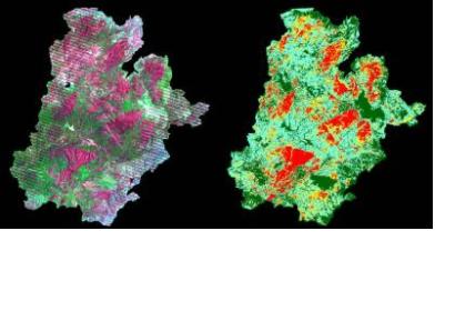 The satellite data can tell scientists and land managers how fire transforms the land surface as well as enable them to measure how this transformation alters the ecosystem. For example, intensely burned soils resist rainwater infiltration, leading to increased runoff, erosion, land slides and flooding. Land managers use satellite data to help indentify, locate and map burned areas most susceptible to increased runoff and erosion. Fire response teams then treat burned sites with a variety of measures to minimize erosion, such as spreading ryegrass seeds to stabilize the soil, and placing straw mulch on hill slopes for ground cover to intercept rainfall before it hits the burned soil.
