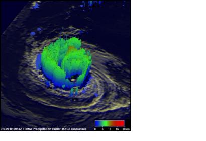 NASA's TRMM satellite passed over the hurricanes that are passing over the Eastern Pacific Ocean: Emilia and Daniel. In pinpointed the intensity of the rainfall within each storm, the data reveals their power. Emilia is dropping rain at a greater rate than Daniel according to satellite data. TRMM flew above hurricane Daniel on July 8, 2012 at 0019 UTC and over Emilia when it was a tropical storm on July 8, 2012 at 0837 UTC. Rainfall data collected with TRMM's Microwave Imager (TMI) and Precipitation Radar (PR) instruments was overlaid on enhanced infrared and visible images from TRMM's Visible and InfraRed Scanner (VIRS) at NASA's Goddard Space Flight Center in Greenbelt, Md. to show the intensity of the rain falling within each storm.