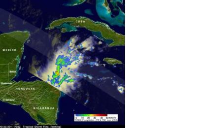 The National Hurricane Center (NHC) upgraded an area of disturbed weather in the Caribbean to tropical depression eighteen and then to tropical storm Rina on October 23, 2011. The TRMM satellite flew over the forming tropical cyclone on October 23, 2011 at 1728 UTC (1:28 p.m. EDT).
