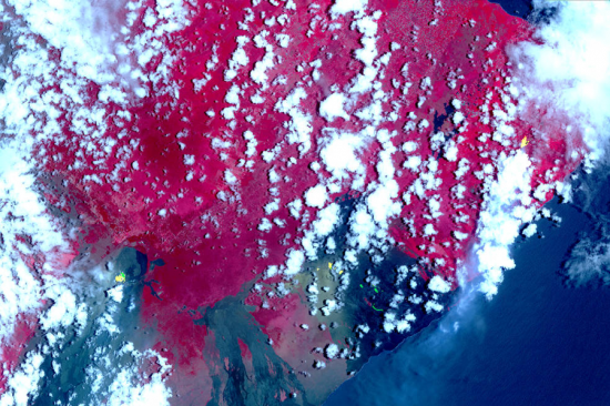 Satellite images taken by NASA on 6 May 2018 show a number of gas- and lava-oozing fissures in the East Riff Zone of Kilauea volcano. Images taken from the Advanced Spaceborne Thermal Emission and Reflection Radiometer (ASTER) onboard NASA’s earth observation satellite, Terra, picked up these new fissures. In the image (above), the red areas are vegetation, and the black and gray areas are old lava flows. The yellow areas superimposed over the image show hot spots that were detected by ASTER’s thermal infrared bands. Another image released by NASA shows yellow and green streaks depicting sulphur dioxide gas, which can be dangerous to human health at high levels. The satellite also recorded images of the eruption plume of the volcano. Such satellite images are being utilised by civil authorities, scientists and the local population to understand where lava is flowing and where toxic gases are moving in order to take avoidance measures.