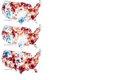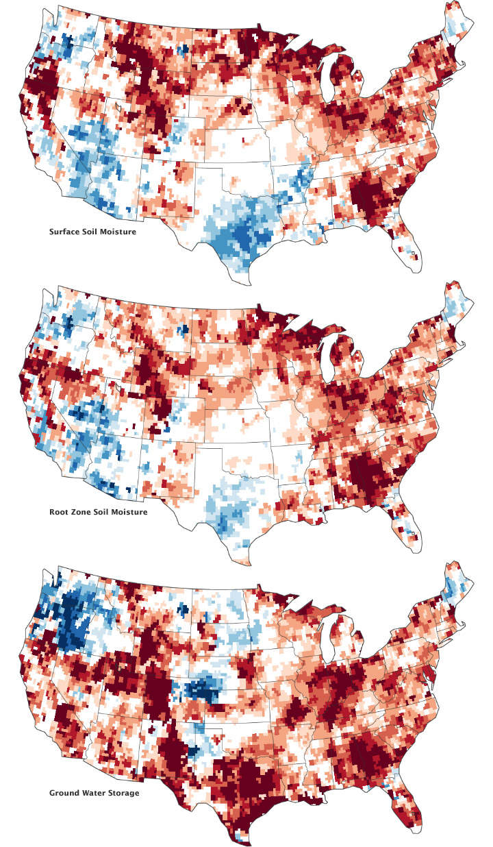 A deep and persistent drought struck vast portions of the continental United States in 2012. Though there has been some relief in the late summer, a pair of satellites operated by NASA shows that the drought lingers in the underground water supplies that are often tapped for drinking water and farming. The maps combine data from the twin satellites of the Gravity Recovery and Climate Experiment (GRACE) with ground-based measurements to map the relative amount of water stored near the surface and underground as of September 17, 2012. The top map shows moisture content in the top 2 centimeters (0.8 inches) of surface soil; the middle map depicts moisture in the “root zone,” or the top meter (39 inches) of soil; and the third map shows groundwater in aquifers.