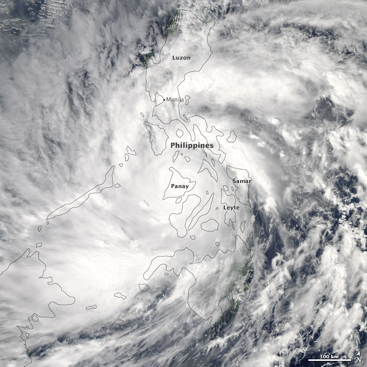 The Moderate Resolution Imaging Spectroradiometer (MODIS) on NASA’s Aqua satellite acquired am image of Super Typhoon Haiyan over the Philippines on 8 November 2013. The image was acquired at 2:10 p.m. local time (5:10 UTC), when winds were estimated to be 270 km/h (165 mph). On 7 November, NASA had already captured the storm from Space before it made landfall.