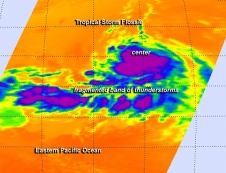 What we see on the picture is one of the previously mentioned infrared images, where the AIRS revealed that the strongest storms and heaviest rains of the Tropical Storm Flossie were around its center and in a fragmented band of thunderstorms south of the center, with cloud top temperatures near -63F/-52C by July 25 (represented in purple).