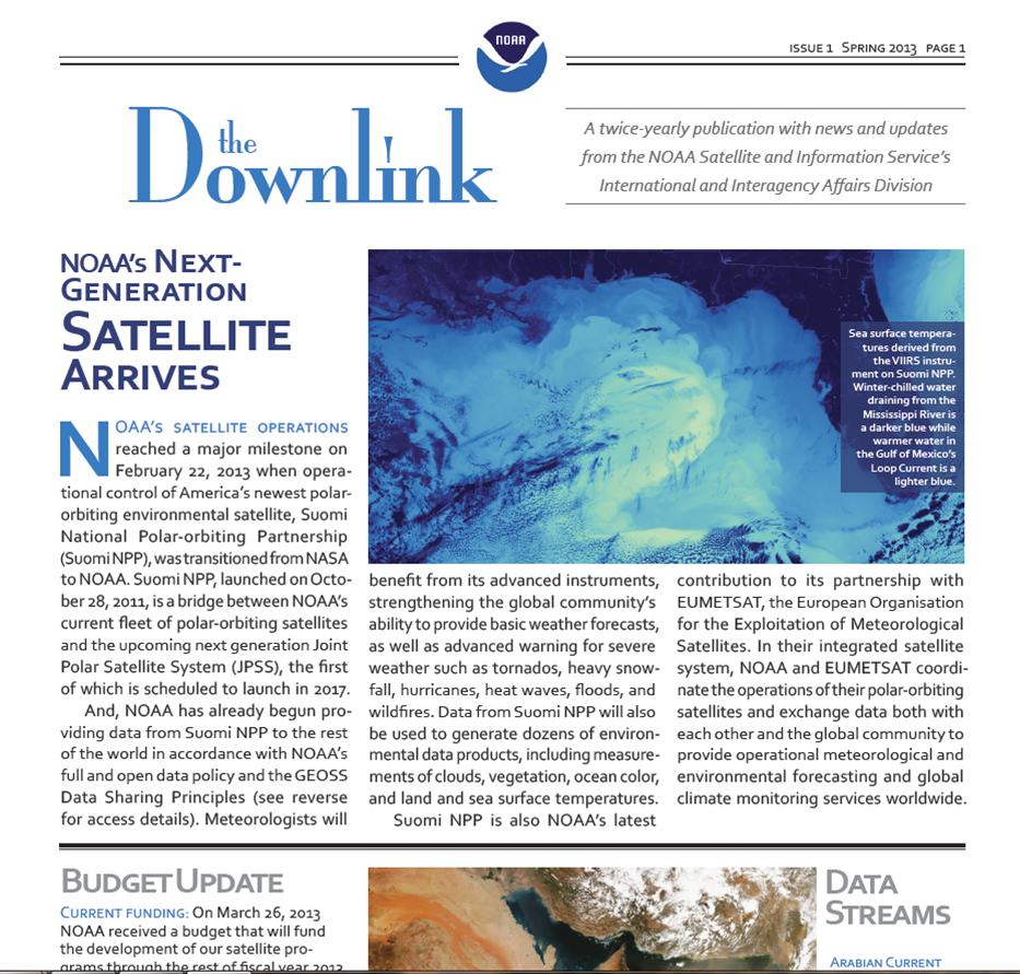 The United States National Oceanic and Atmospheric Administration (NOAA) has launched a newsletter "The Downlink". The Downlink will provide international and interagency experts working with space-based information with short updates on all of NOAA's current and future satellite programs, and also current information on the budget cycle. Published twice per year, The Downlink will also include a feature article on exciting NESDIS developments and examples of NOAA's satellite imagery and derived products.