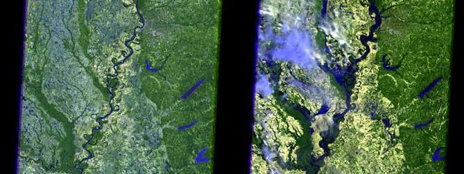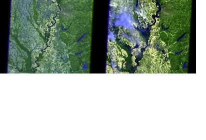 The scenes captured by Landsat 5 show the Mississippi River in the Memphis, Tenn. area, and along the state borders of Tennessee, Kentucky, Missouri, and Arkansas. The January images show the river before it began to flood. In the May images, the dark blue tones are water, the light green is cleared fields, and the light tones are clouds.