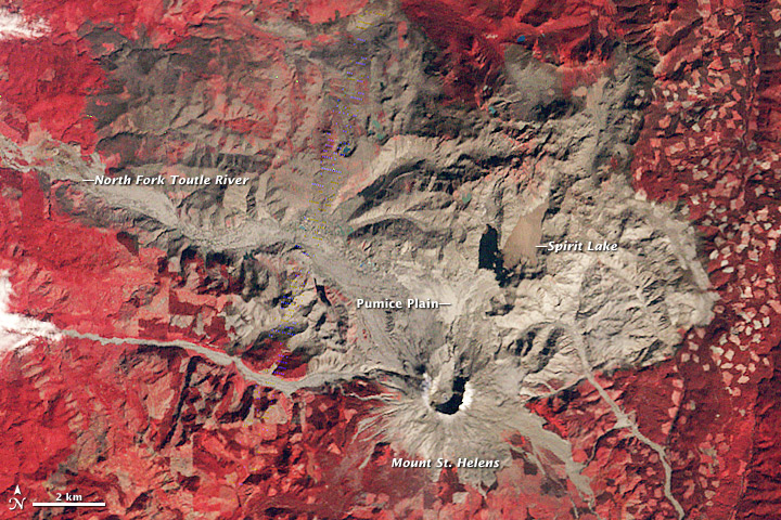 With the help of NASA Landsat satellite imagery, scientists tracked the recovery of Mt. St. Helens over the last three decades. NASA elaborates: "In the three decades since the eruption, Mt. St. Helens has given scientists an unprecedented opportunity to witness the intricate steps through which life reclaims a devastated landscape. The scale of the eruption and the beginning of reclamation in the Mt. St. Helens blast zone are documented in this series of images captured by NASA’s Landsat series of satellites between 1979 and 2011. The older images are false-color (vegetation is red) because earlier Landsats could not “see” blue light. To make a photo-like satellite image, you need red, green, and blue wavelengths of light."