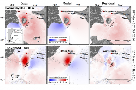 Ebmeier, S.K., Elliott, J.R., Nocquet, J.M., Biggs, J., Mothes, P., Jarrín, P., Yépez, M., Aguaiza, S., Lundgren, P. and Samsonov, S.V. (2016): Shallow earthquake inhibits unrest near Chiles–Cerro Negro volcanoes, Ecuador–Colombian border. Earth and Planetary Science Letters, 450.