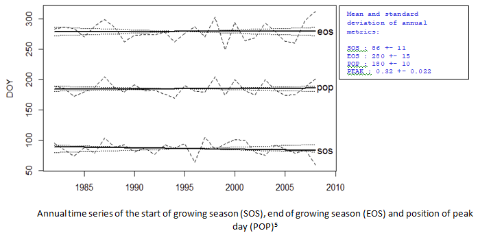An EVI time-series can be used to identify temporal changes in vegetation by reflecting seasonal and inter-annual variations of climatic parameters such as irradiance, temperature, and rainfall. Phenology and greenness metrics (PGMs) based on EVI considered in the EviDENz projects include the start of growing season (SOS), the end of growing season (EOS), peak of the season (PEAK), and position of peak day (POP).