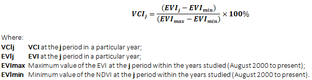 Low values indicate bad vegetation conditions, while high values indicate good vegetation conditions. The VCIj values between 50% to 100 % indicate optimal or above-normal conditions. At a VCIj value of 100%, the EVIj is equal to the maximal EVI value measured (EVImax). Different degrees of a drought severity is indicated by VCIj values.
