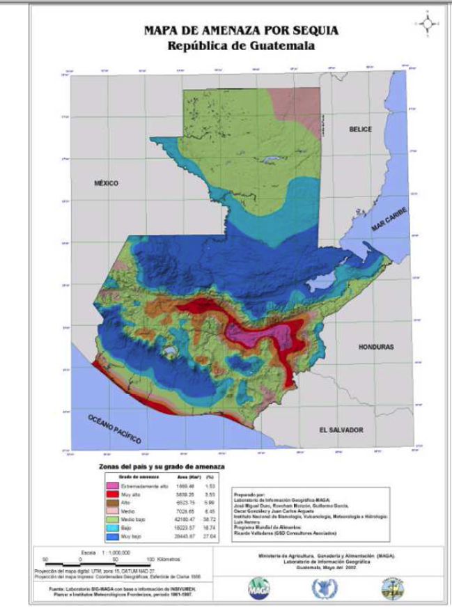 Two regions have a high exposition to drought hazard: a narrow segment of the Pacific coastline and a geographical region located to the north of the volcanic chain and to the Sierra de las Minas mountain range, and to the west of the Merendon mountain ranges.This second region has been called the “corredor seco” or dry corridor and includes areas of the Quiche, Baja Verapaz, Chiquimula, Zacapa, El Progreso, Jutiapa and Jalapa departments.